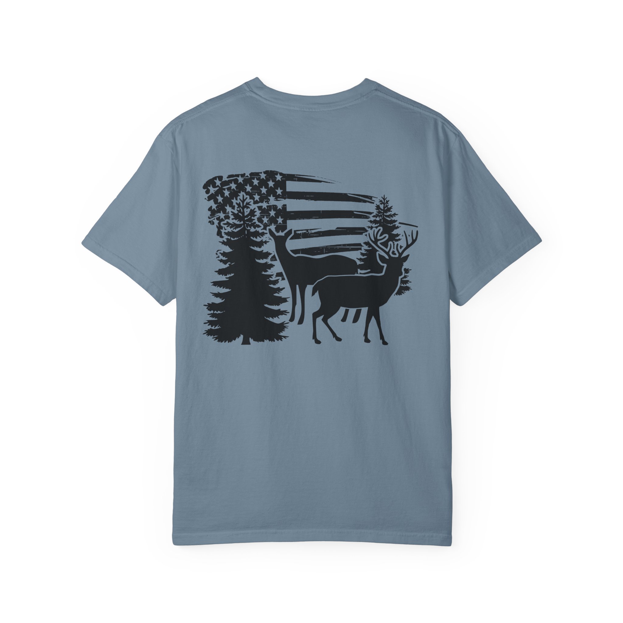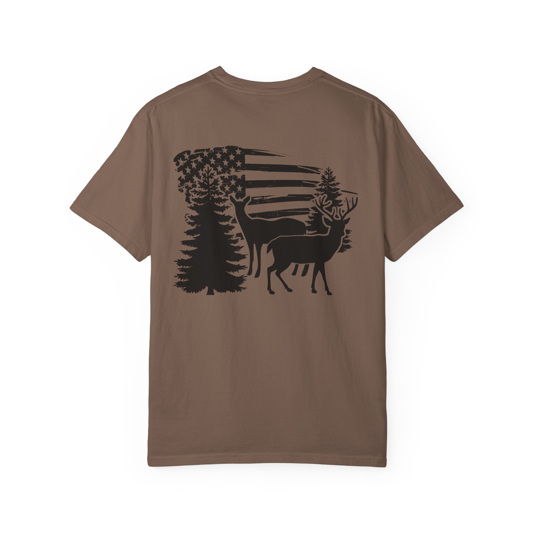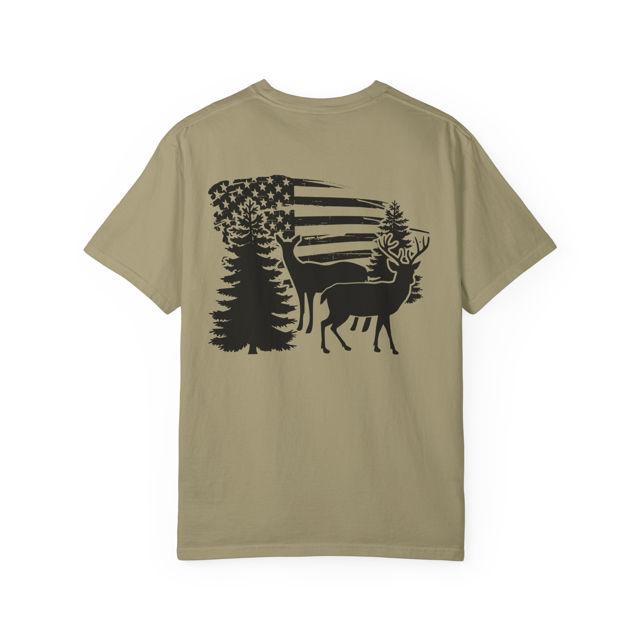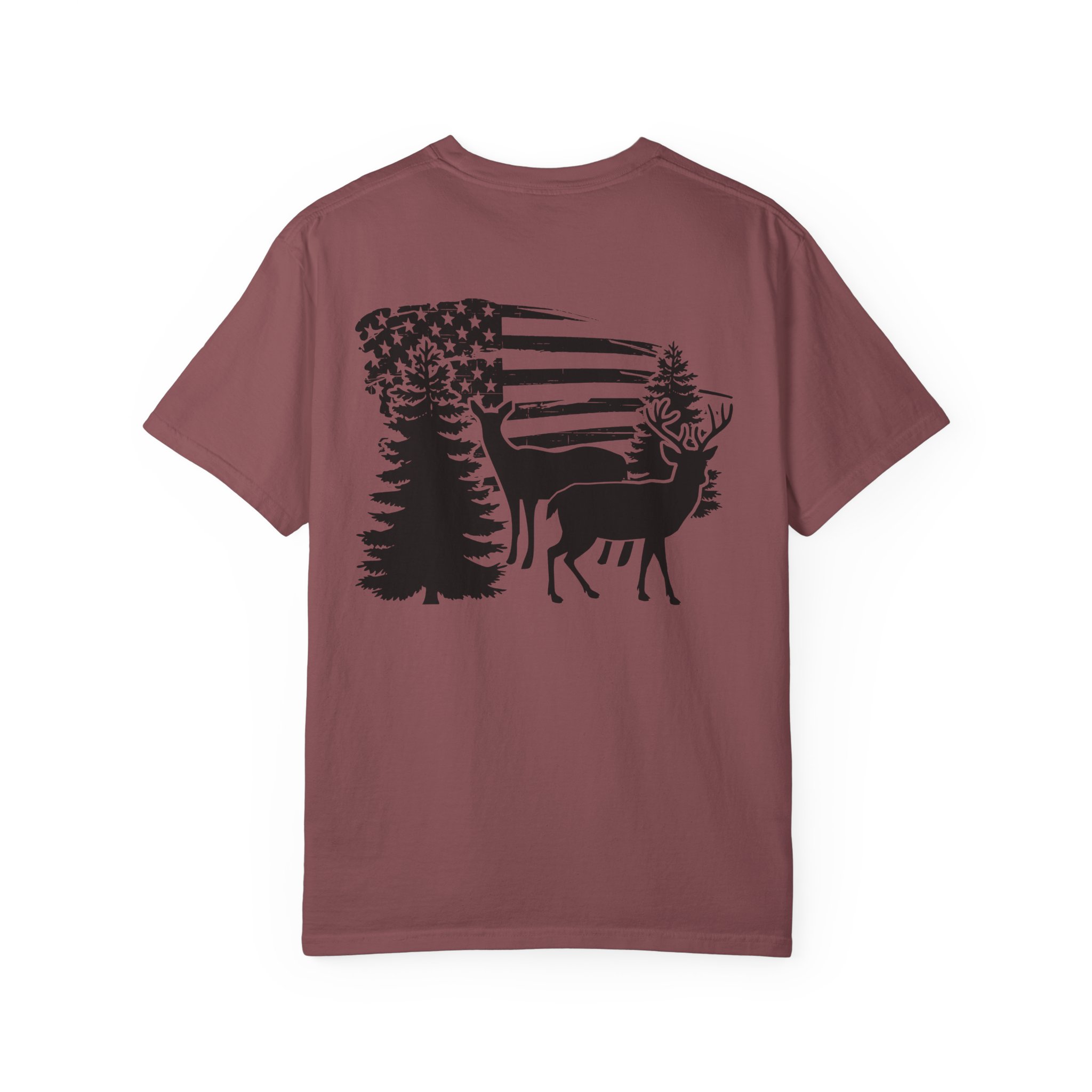 This rugged men’s t-shirt features a striking image of a buck in front of the American flag on the front, combining patriotic pride with a love for the great outdoors. On the back, a detailed mountain scene showcases a majestic buck and doe against a scenic wilderness backdrop. Made from soft, durable fabric, this tee is perfect for hunters, nature lovers, or anyone who embraces outdoor adventure with an American spirit.