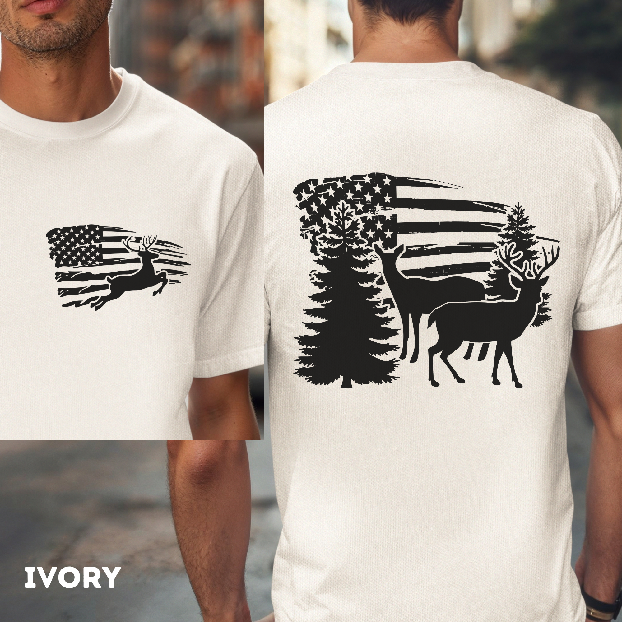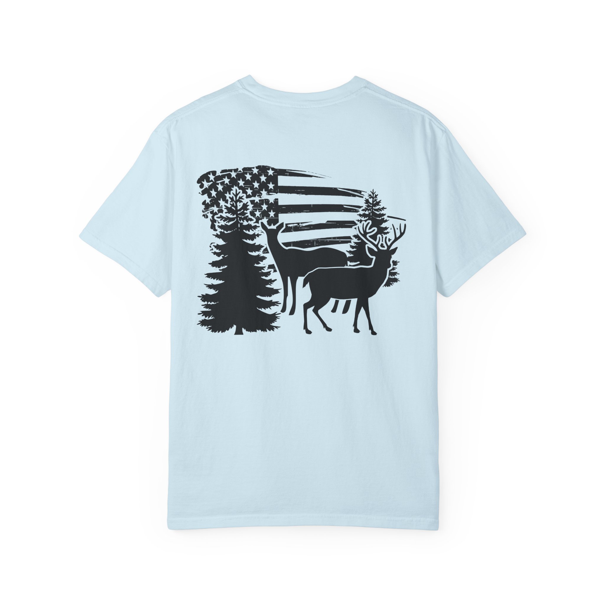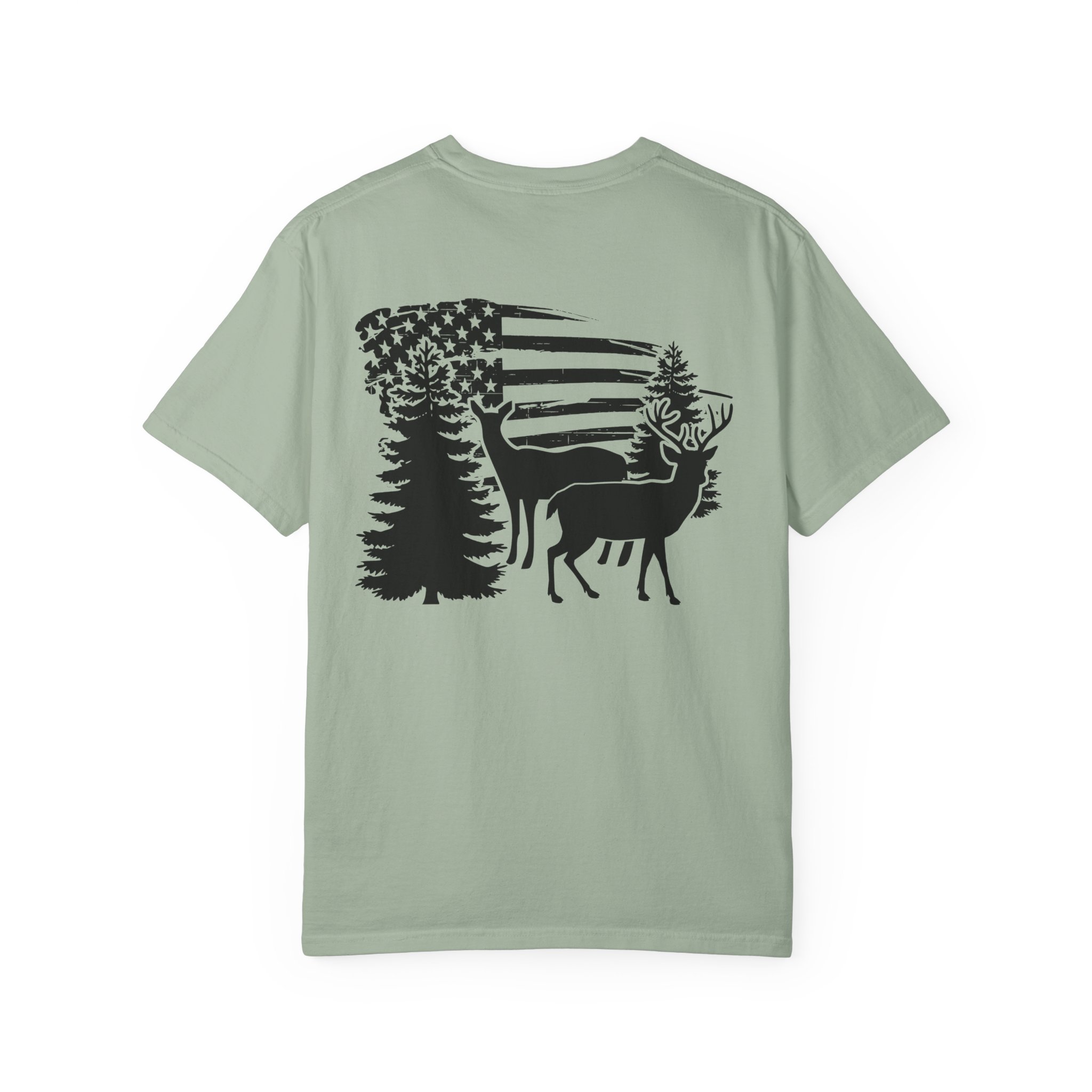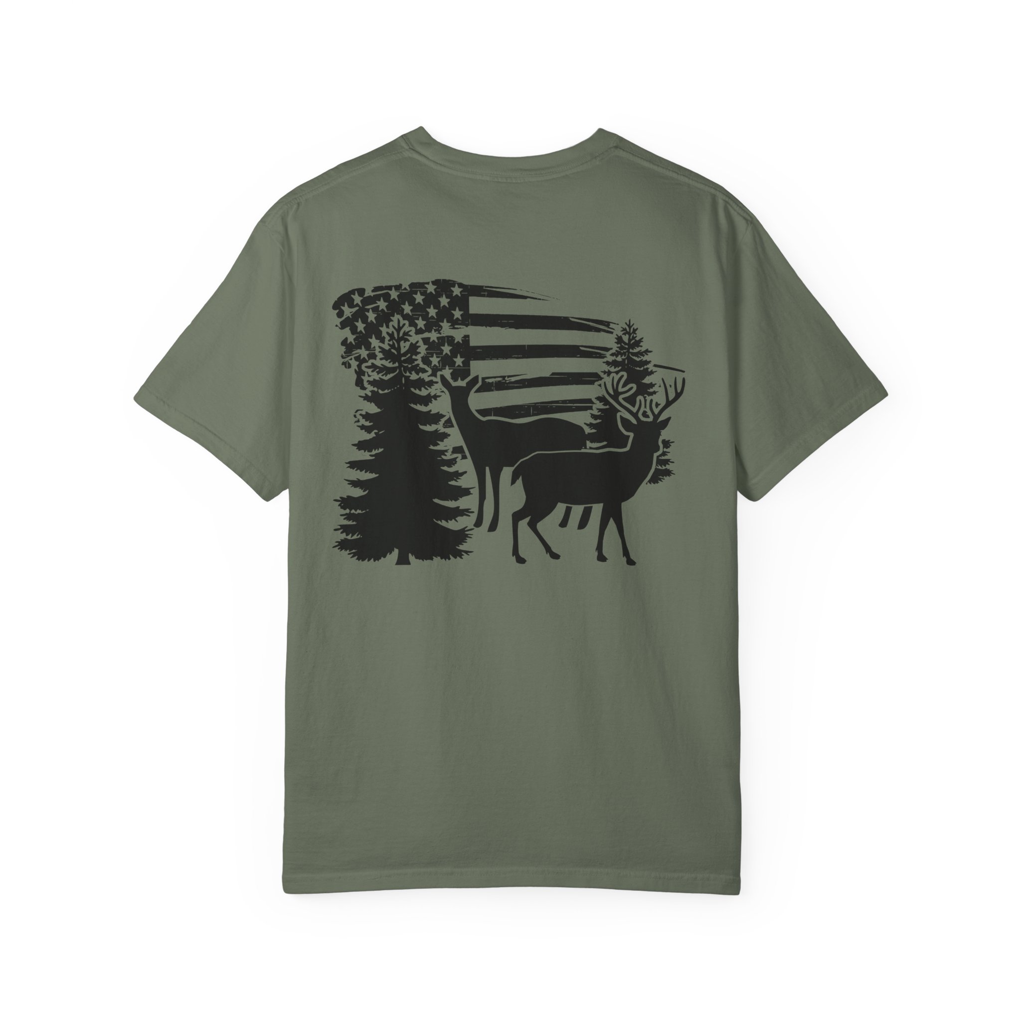 This rugged men’s t-shirt features a striking image of a buck in front of the American flag on the front, combining patriotic pride with a love for the great outdoors. On the back, a detailed mountain scene showcases a majestic buck and doe against a scenic wilderness backdrop. Made from soft, durable fabric, this tee is perfect for hunters, nature lovers, or anyone who embraces outdoor adventure with an American spirit.