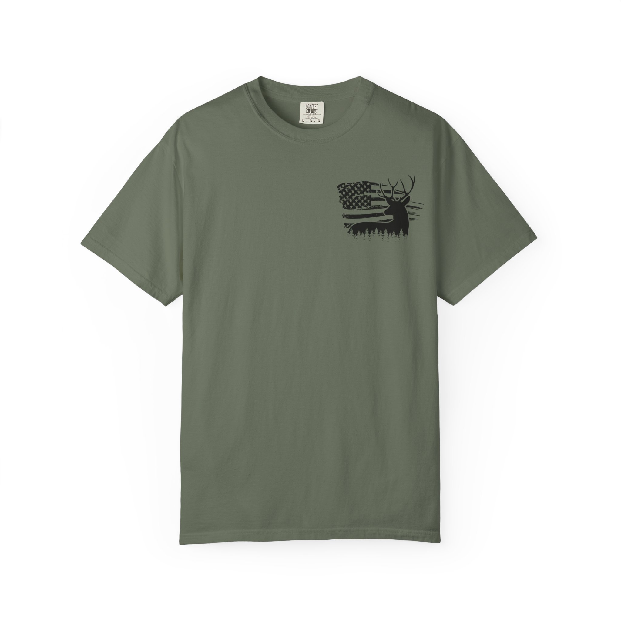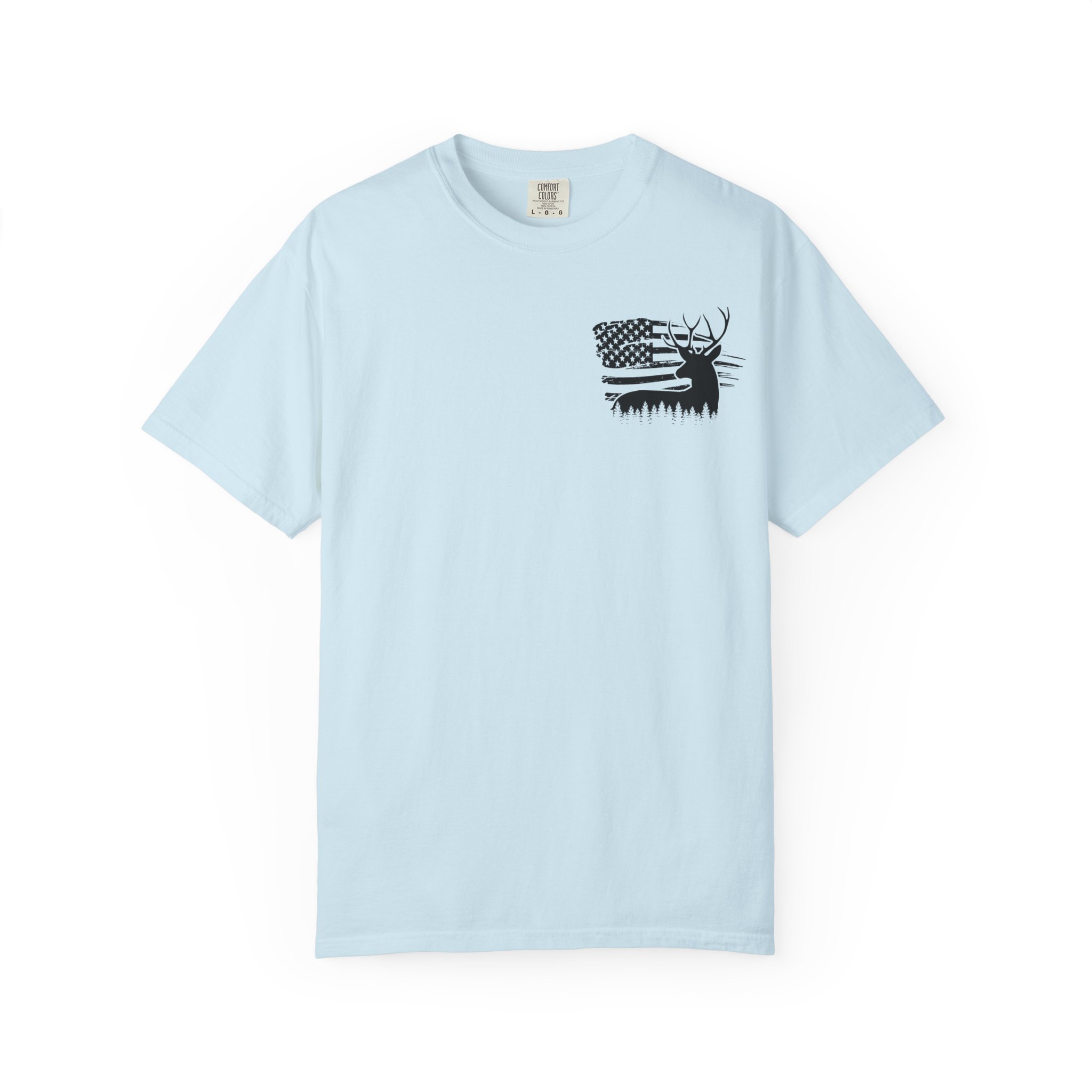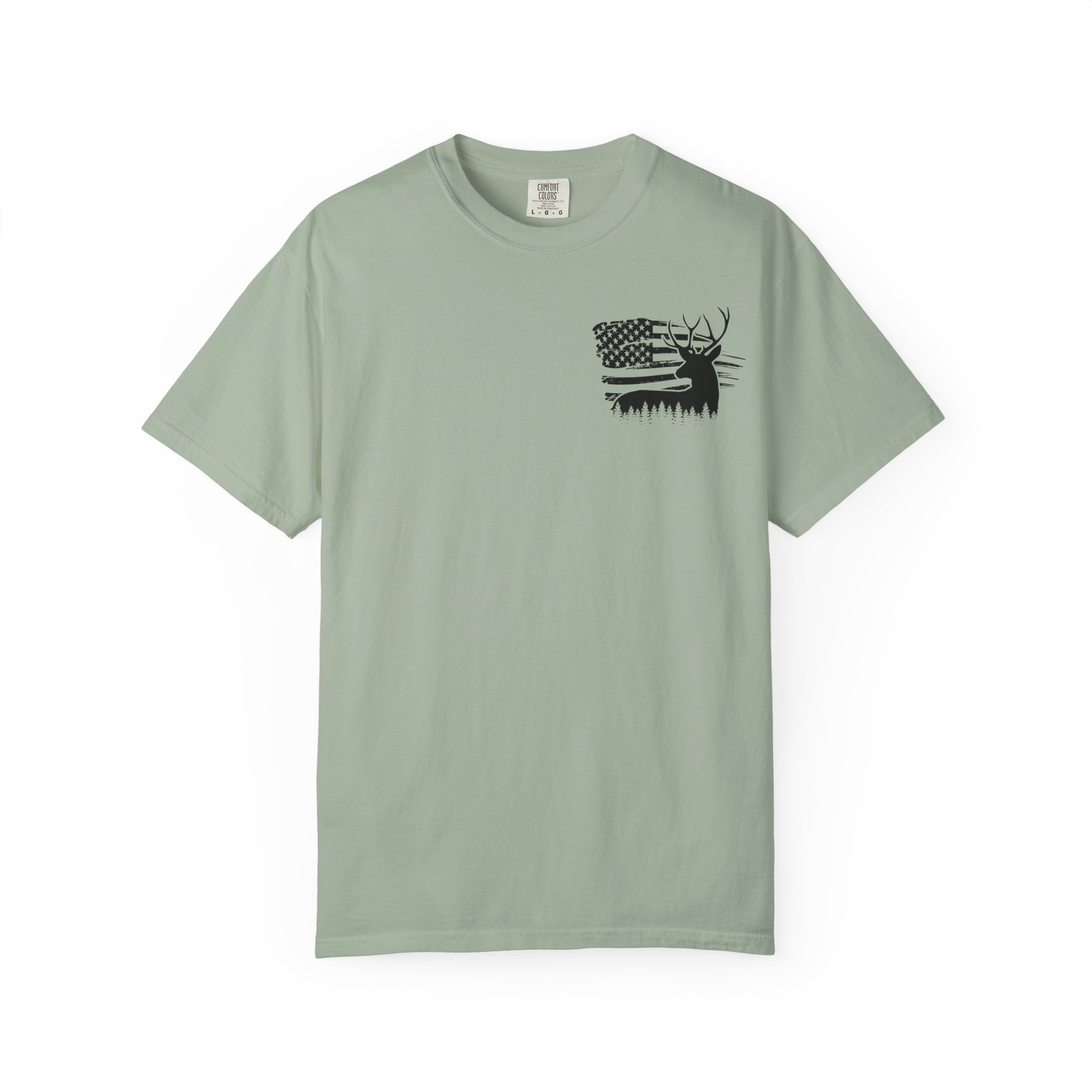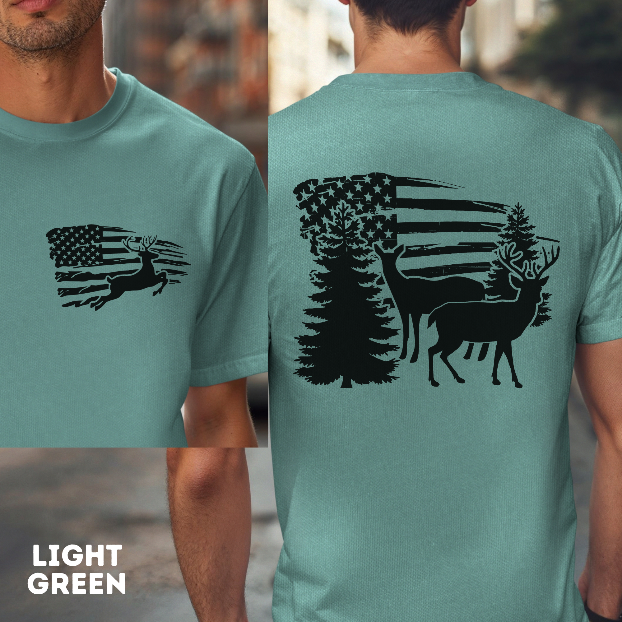 This rugged men’s t-shirt features a striking image of a buck in front of the American flag on the front, combining patriotic pride with a love for the great outdoors. On the back, a detailed mountain scene showcases a majestic buck and doe against a scenic wilderness backdrop. Made from soft, durable fabric, this tee is perfect for hunters, nature lovers, or anyone who embraces outdoor adventure with an American spirit.